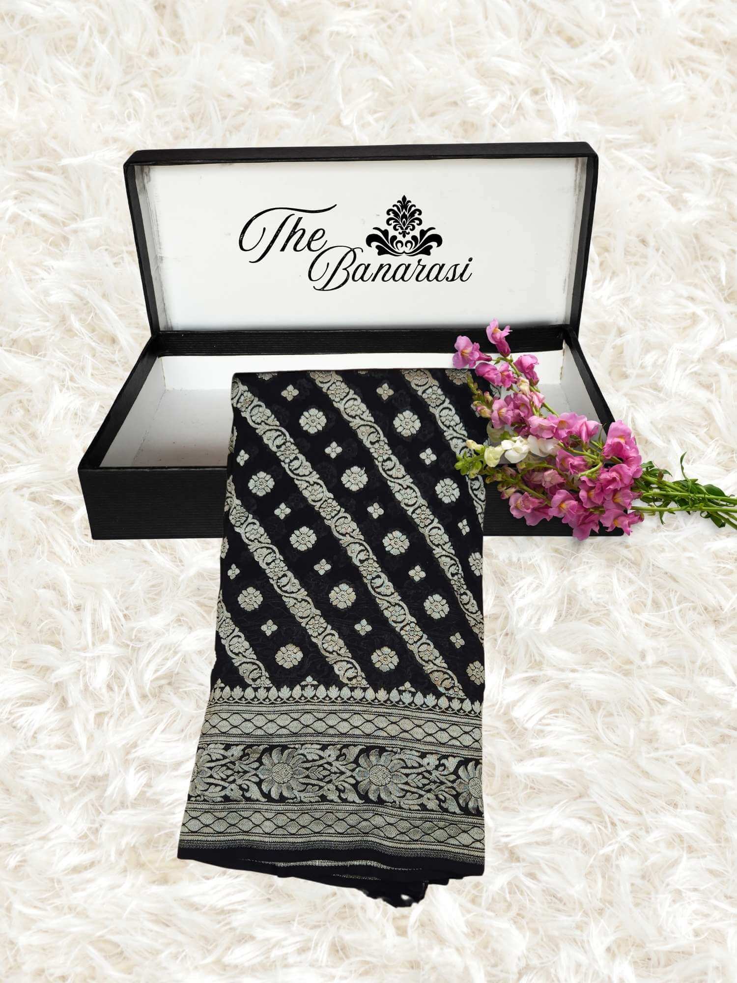 Presenting to you a Black Khaddi Georgette Banarasi Handloom Saree with Water Zari Work. The Georgette Saree has a lightweight and comfortable fabric. The saree is beautifully crafted with water zari work and it is perfect for weddings or festivals.