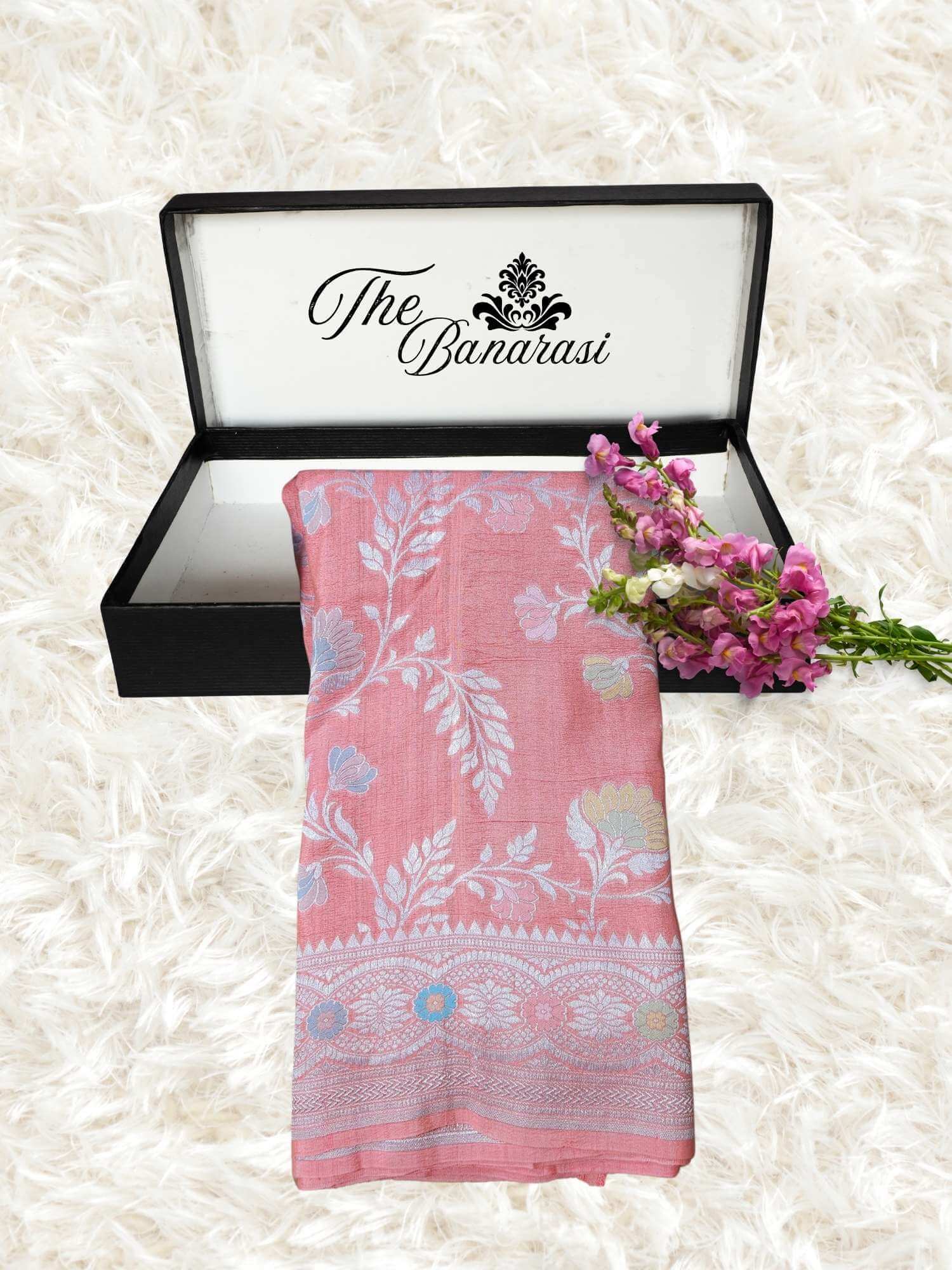 We use the traditional handloom weaving technique, due to the slow or careful process, it takes a few days or a week to complete the saree but using this handwoven technique, our artisans put in a lot of effort to create a beautiful Banarasi saree.
