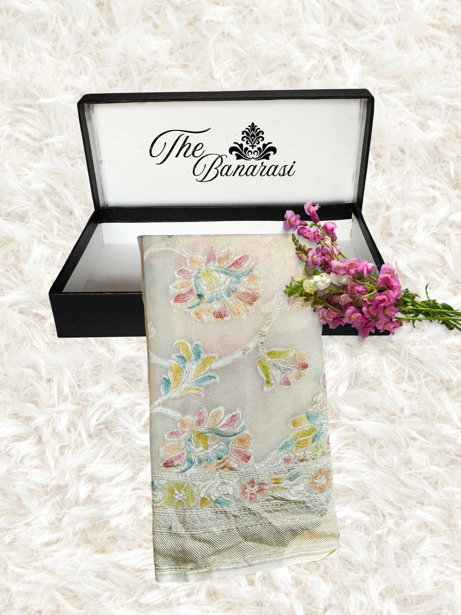 Cream Color Khaddi Georgette Water Zari Banarasi Handloom Saree