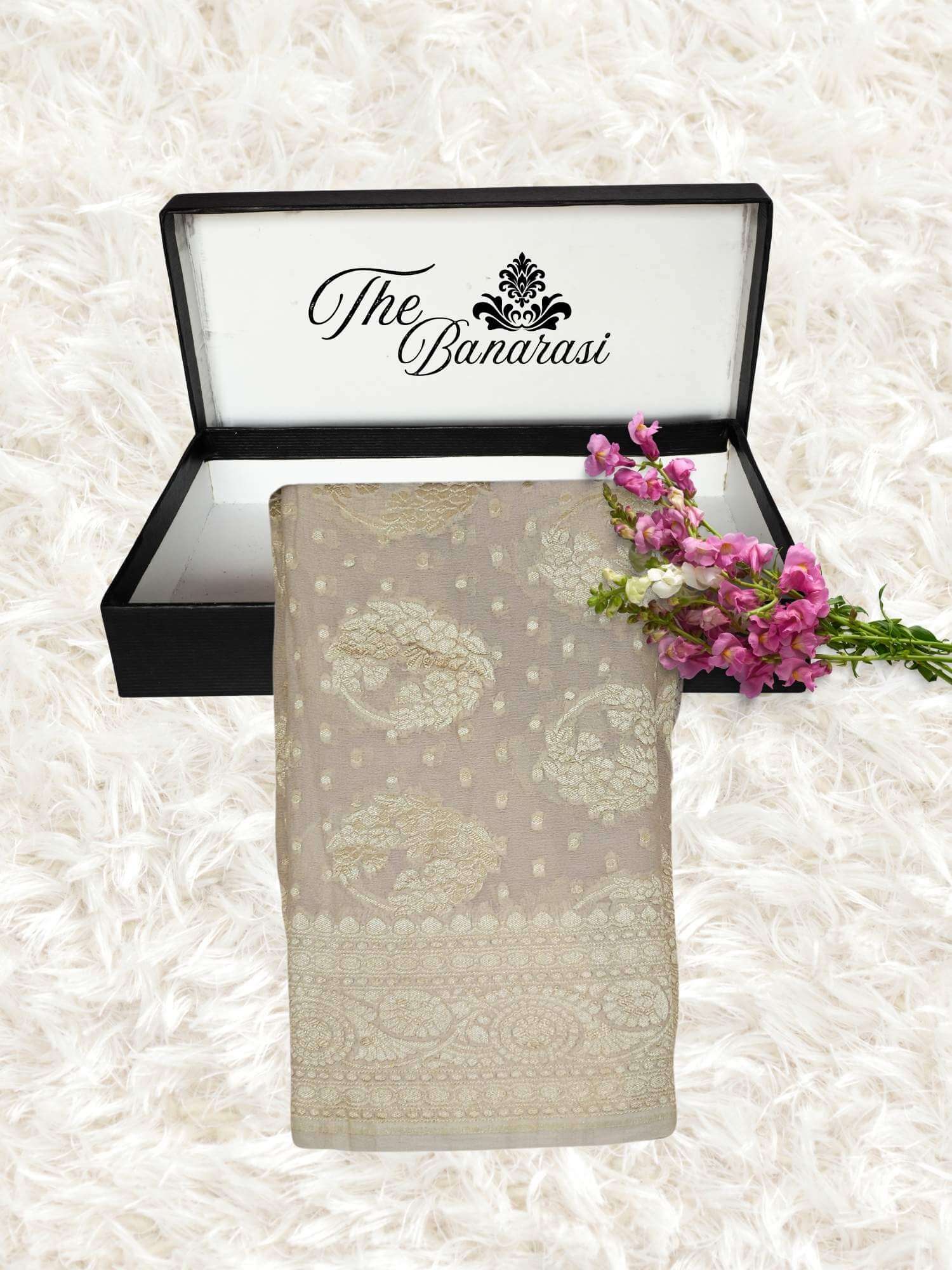 Cream Color Khaddi Georgette Water Zari Banarasi Handloom Saree