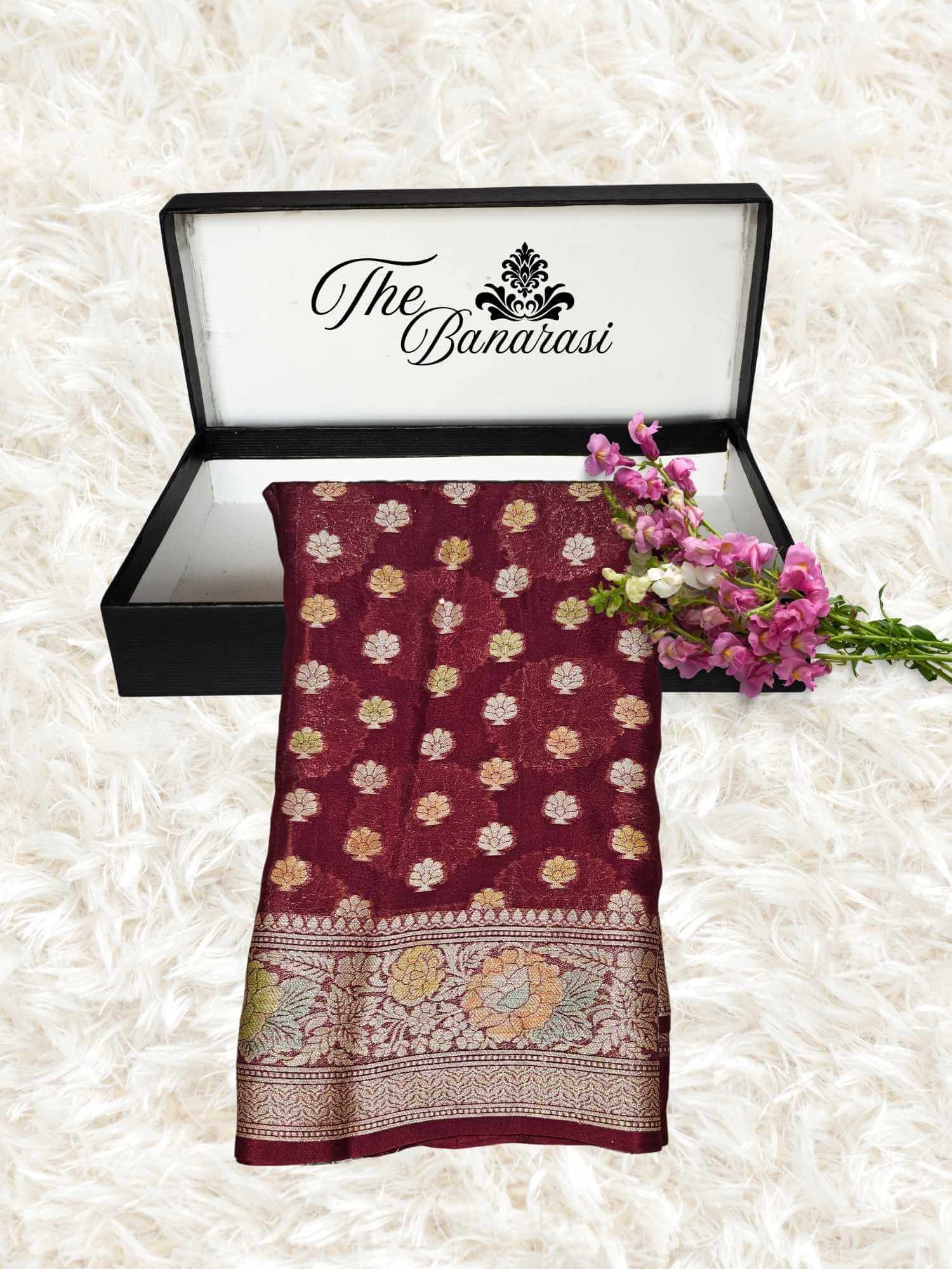 Deep Maroon Pure Chiffon Gold Zari Banarasi Handwoven Saree