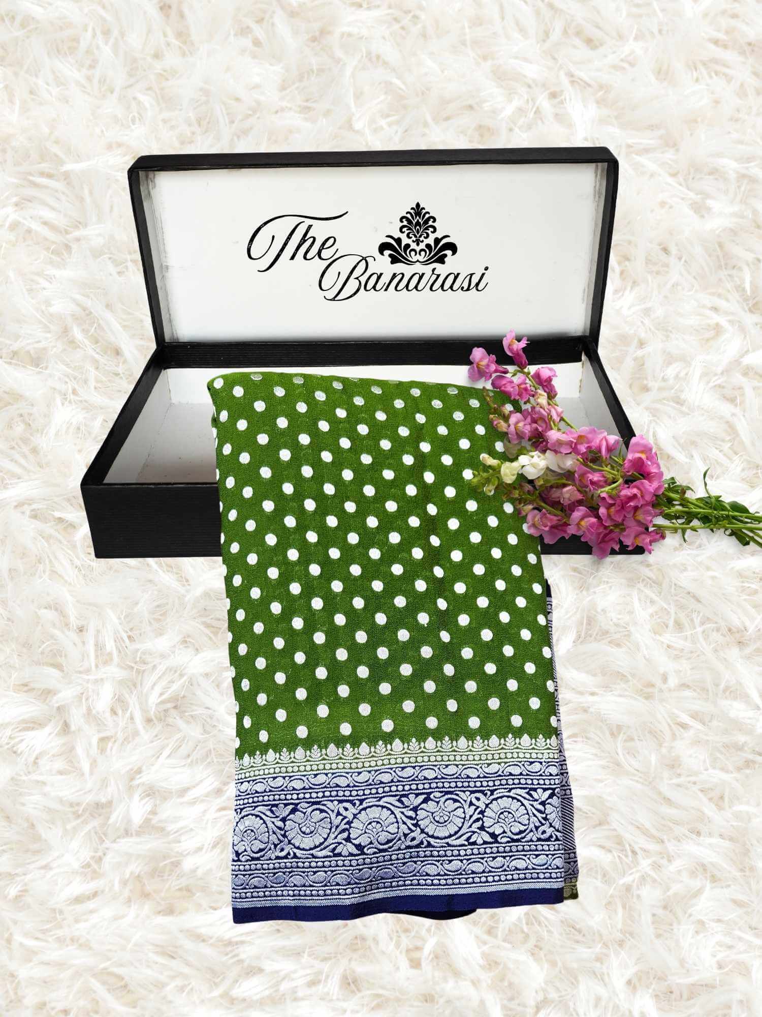 Presenting to you a Dual-hue Khaddi Georgette Banarasi Handloom Saree with Water Zari Work. The Georgette Saree has a lightweight and comfortable fabric. The saree is beautifully crafted with water zari work and it is perfect for weddings or festivals.