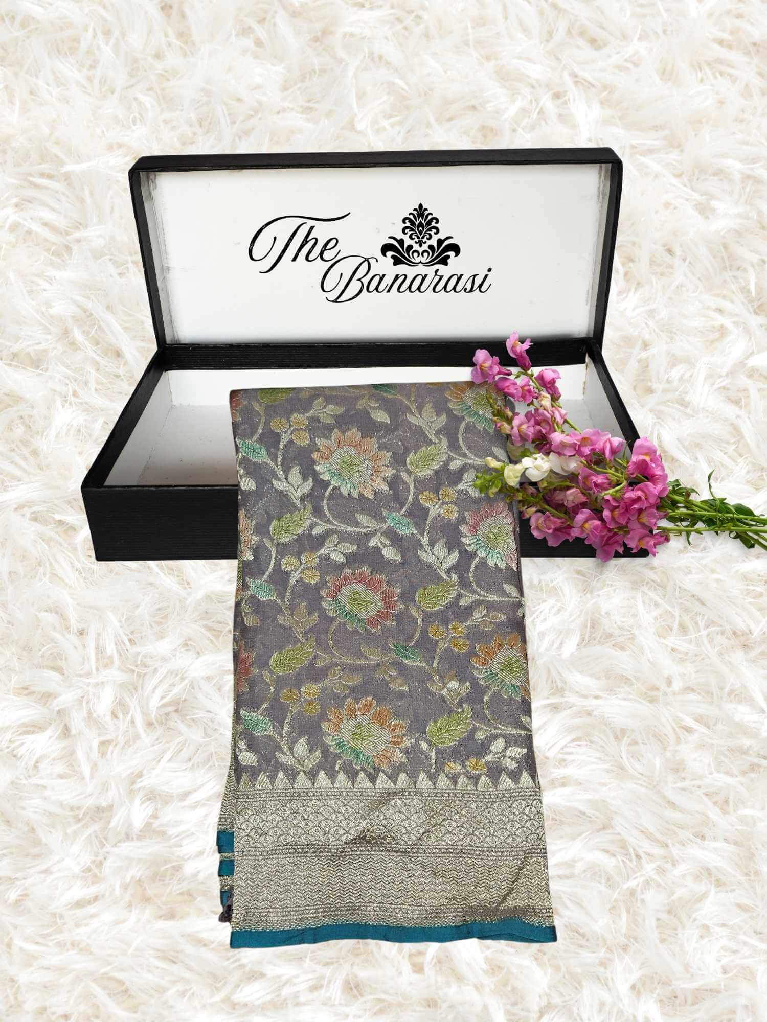 Grey Color Khaddi Georgette Water Zari Banarasi Handloom Saree