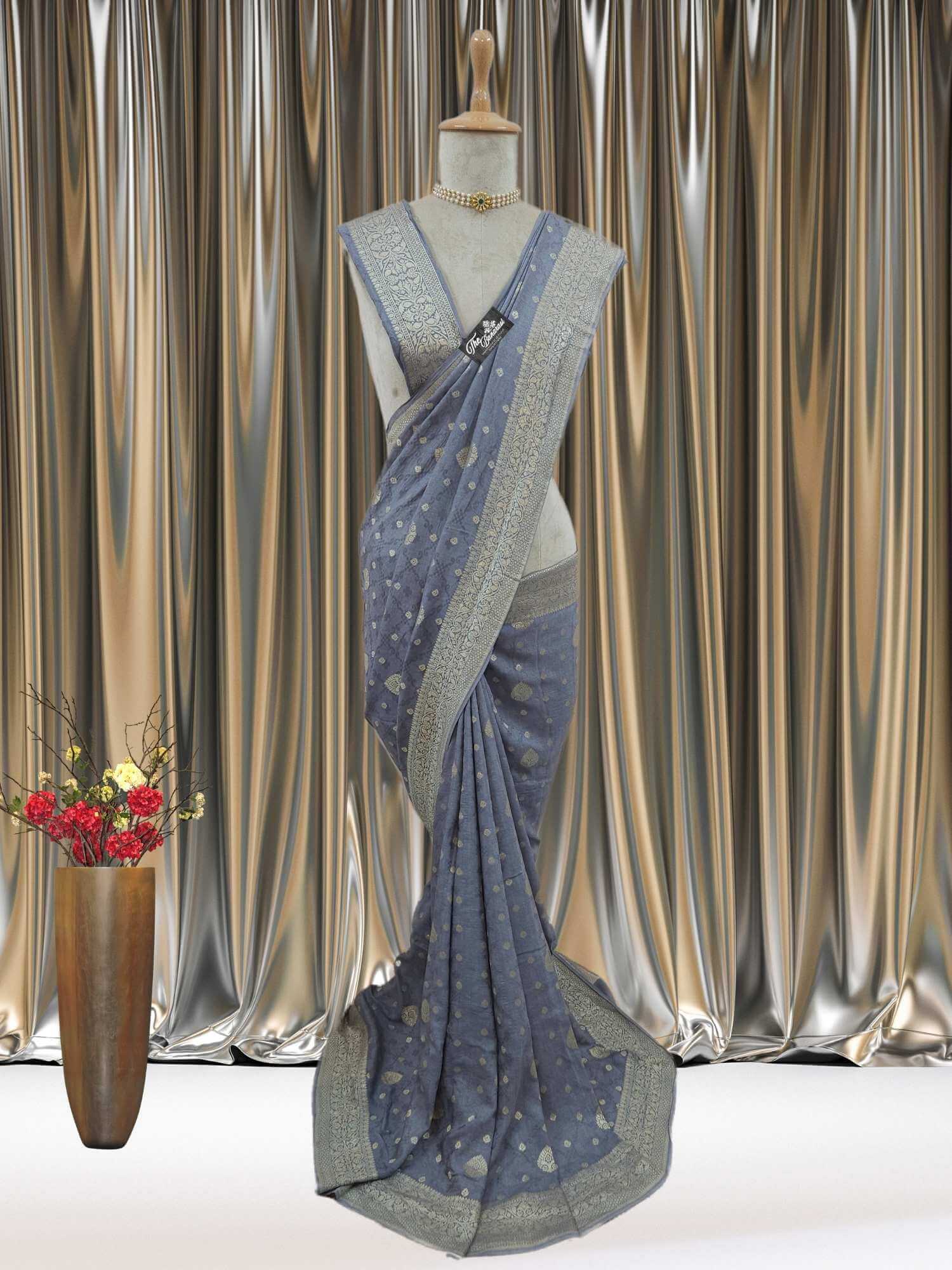 Presenting you a rich Grey Moonga Georgette Banarasi Handloom Saree that is masterfully crafted with delicate Water Zari Work. The Moonga Georgette Saree gives elegance and a traditional look and is crafted in a traditional handloom. Its rich texture and natural sheen add charm at weddings and festivals when you wear it.