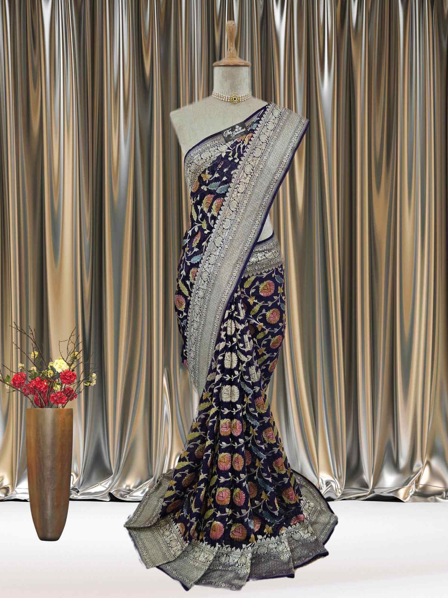 Indigo Blue Khaddi Georgette Hand Brush Banarasi Handloom Saree