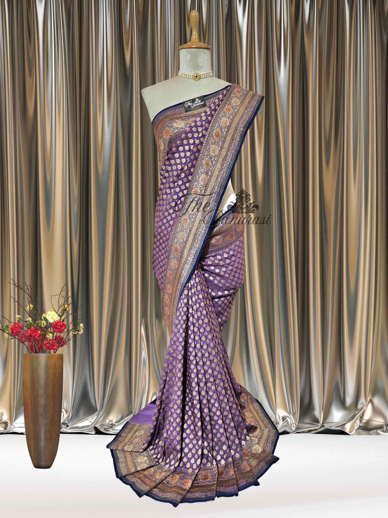 Iris Purple Khaddi Georgette Hand Brush Antique Zari Banarasi Handloom Saree