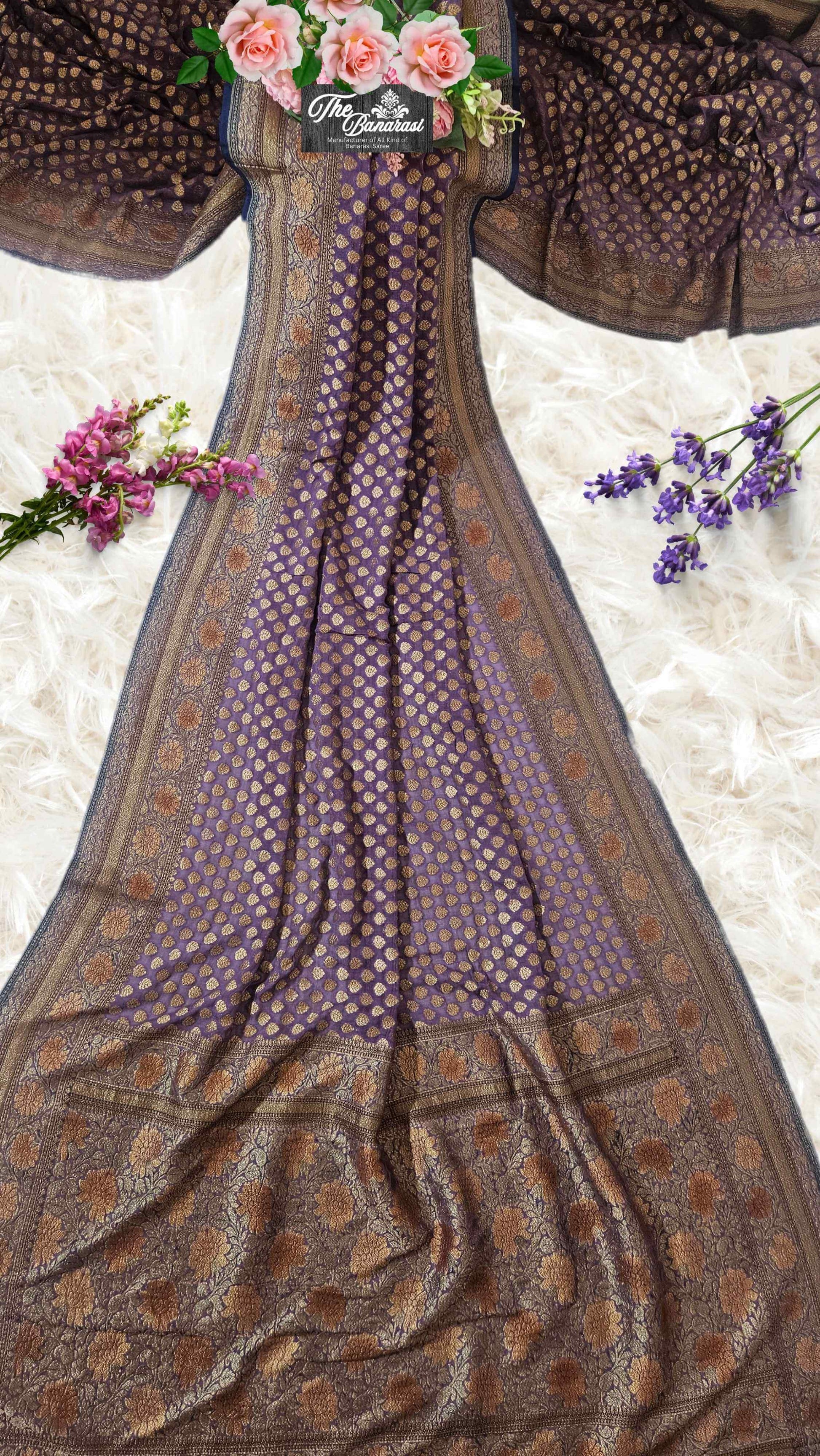 This Iris Purple Pure Khaddi Georgette Banarasi Handloom Saree blends elegance and tradition, crafted with beautiful hand brush antique zari work. Our Georgette is famous for its lightweight fabric and comfort. The khaddi georgette sarees are crafted by skilled Banarasi workers. This saree is perfect for festivals, weddings, and formal occasions. This saree adds a royal touch to your wardrobe with its rich color, qualified fabric, and traditional charm.