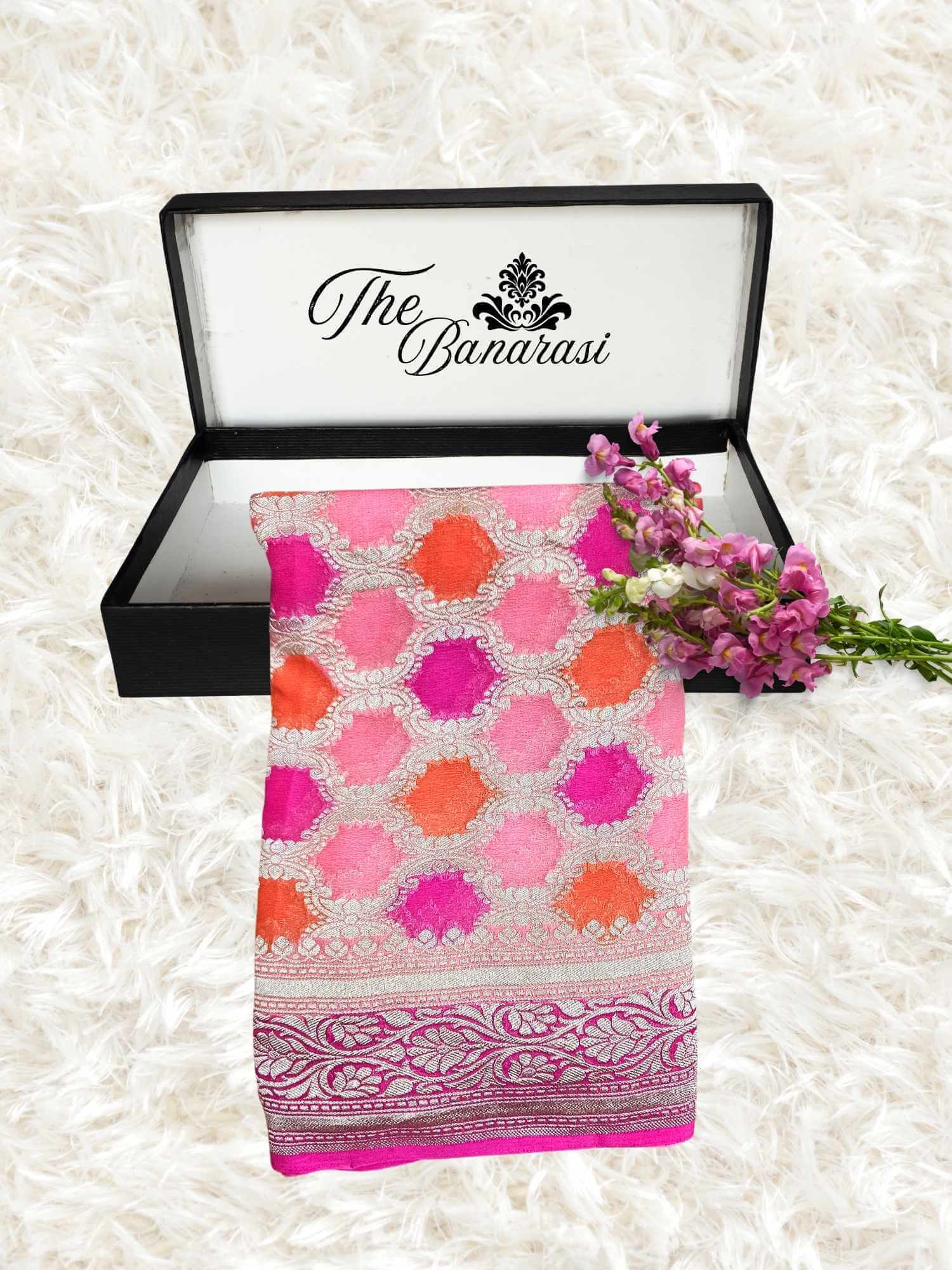 Presenting to you a Multi Color Khaddi Georgette Banarasi Handloom Saree with Water Zari Work. The Georgette Saree has a lightweight and comfortable fabric. The saree is beautifully crafted with water zari work and it is perfect for weddings or festivals.
