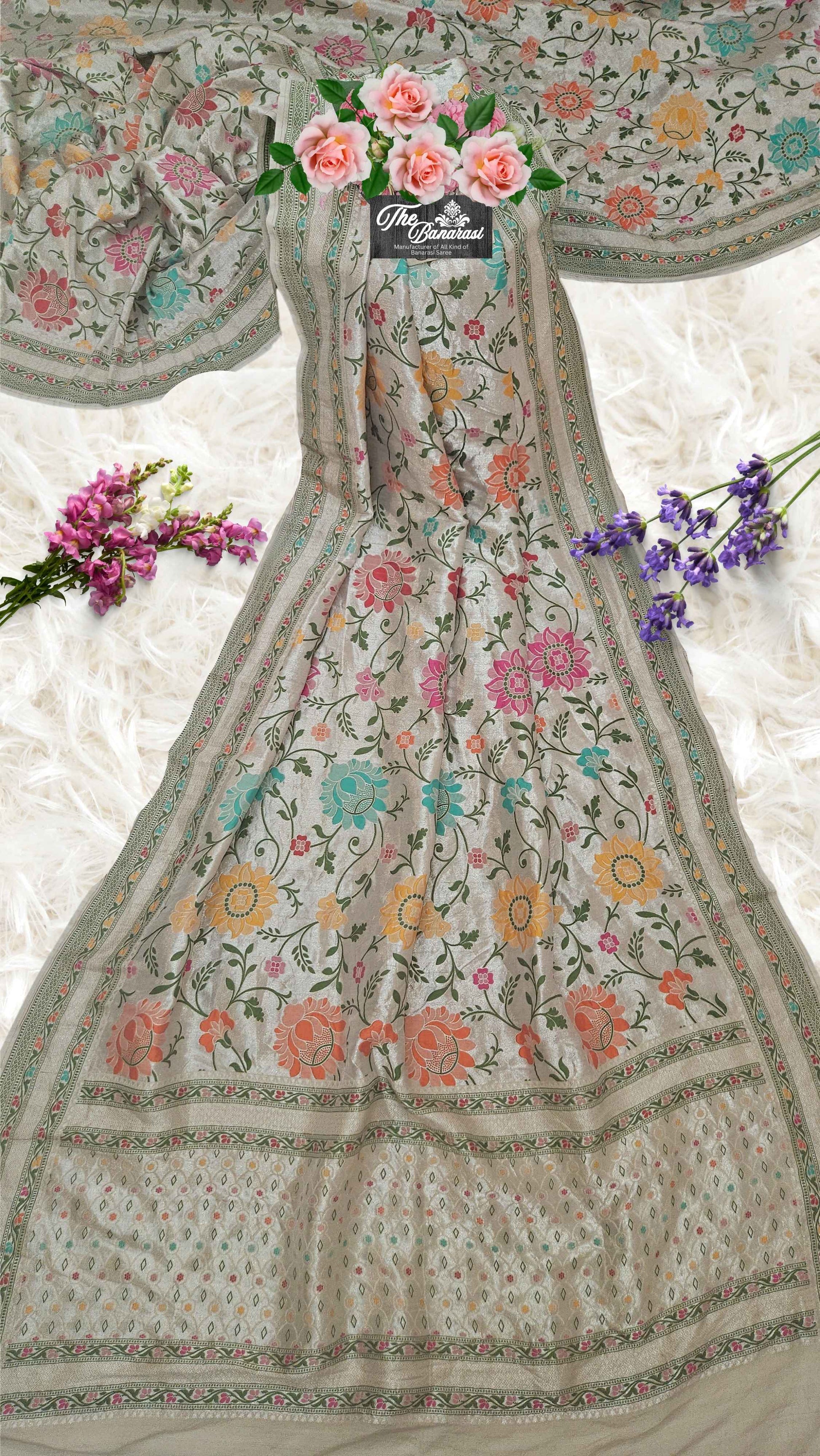 Off White Pure Tussar Georgette Meenakari Design Banarasi Handloom Saree