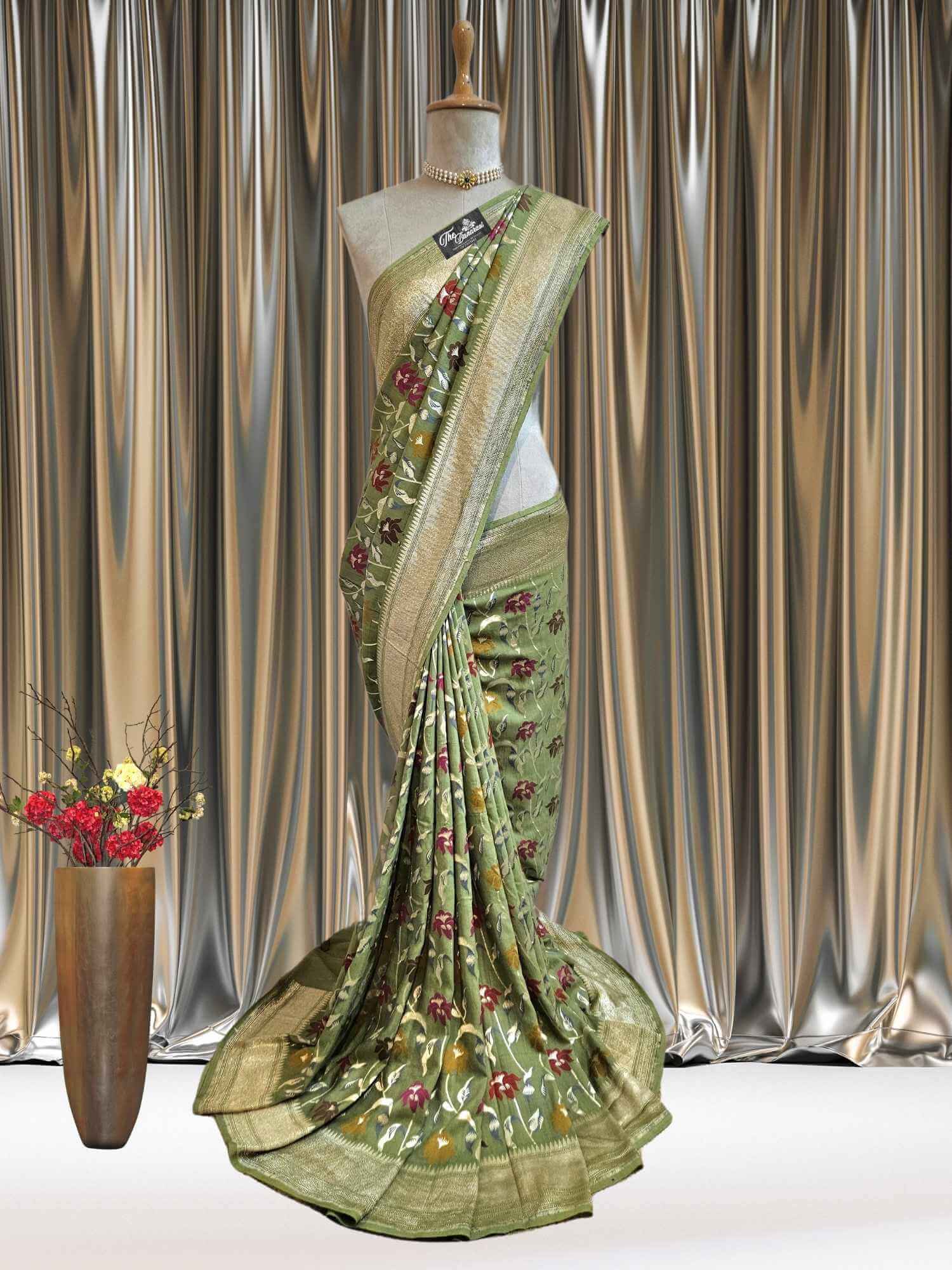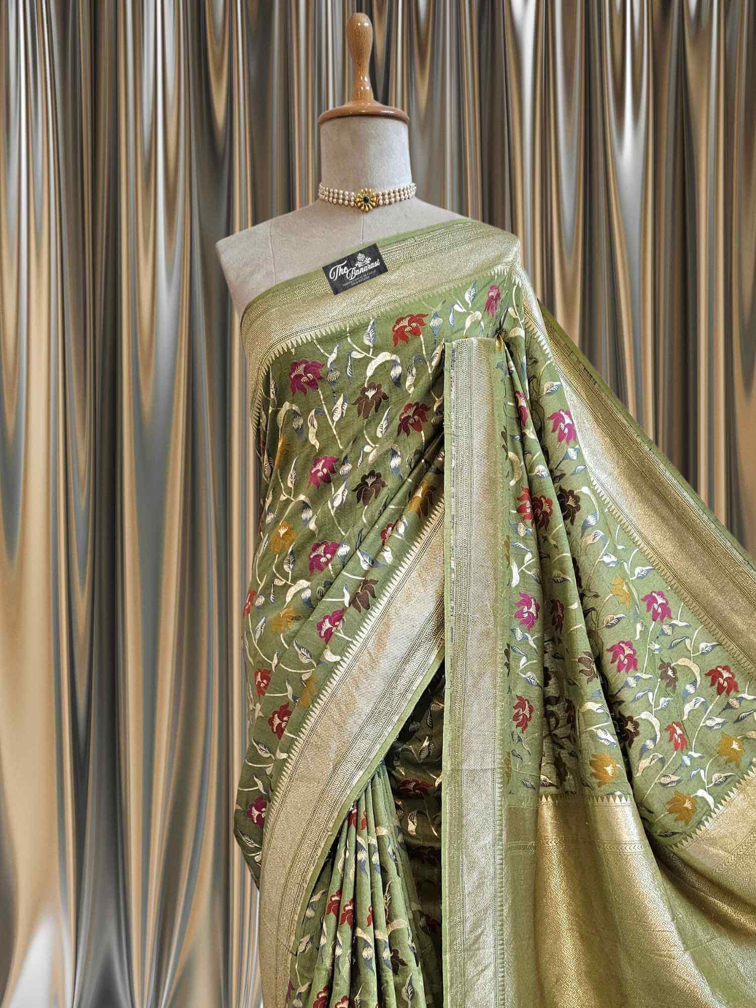 Olive Green Pure Tussar Georgette Meenakari Design Banarasi Handloom Saree