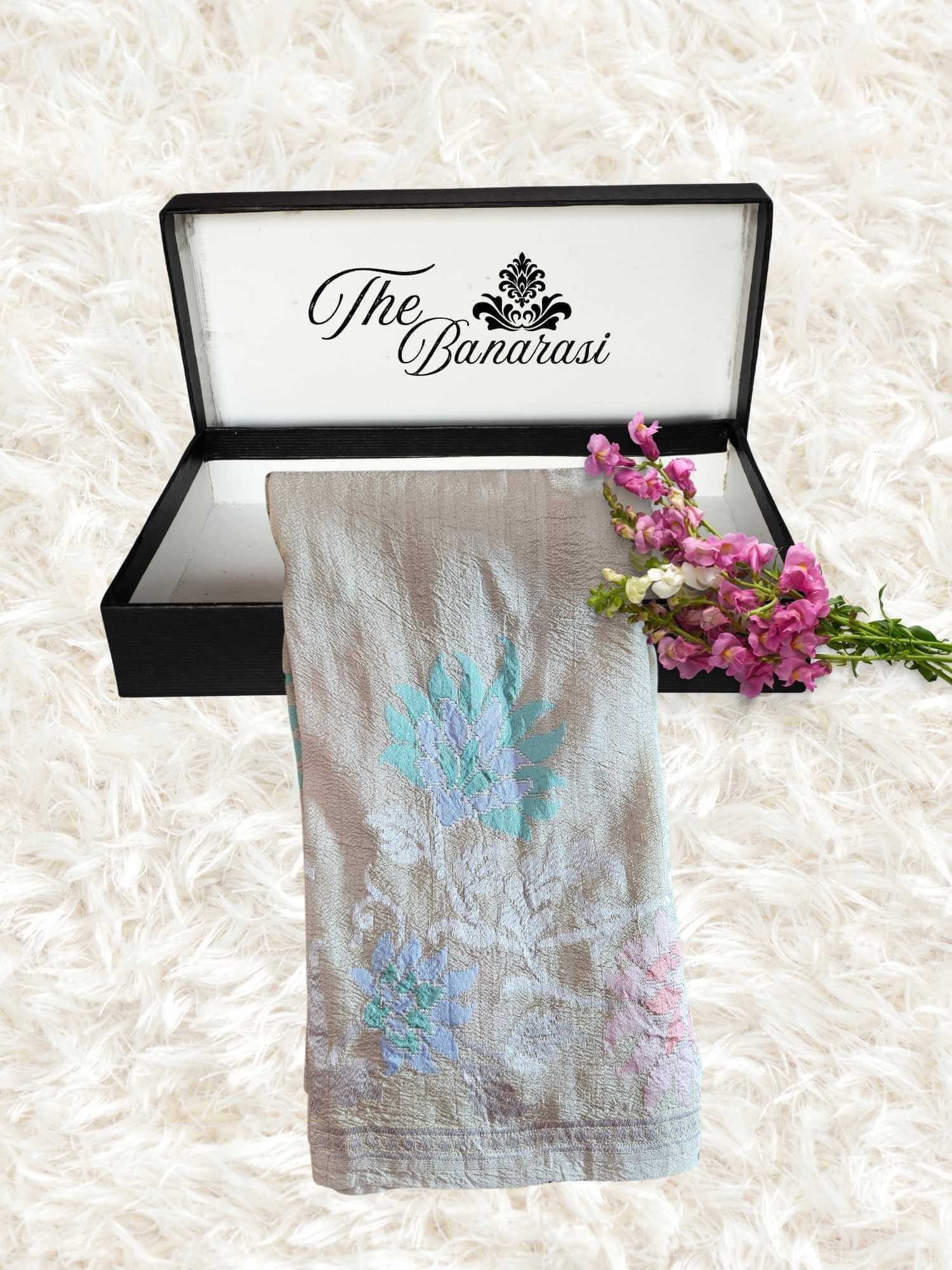 Pearl White Pure Tussar Georgette Meenakari Design Banarasi Handloom Saree