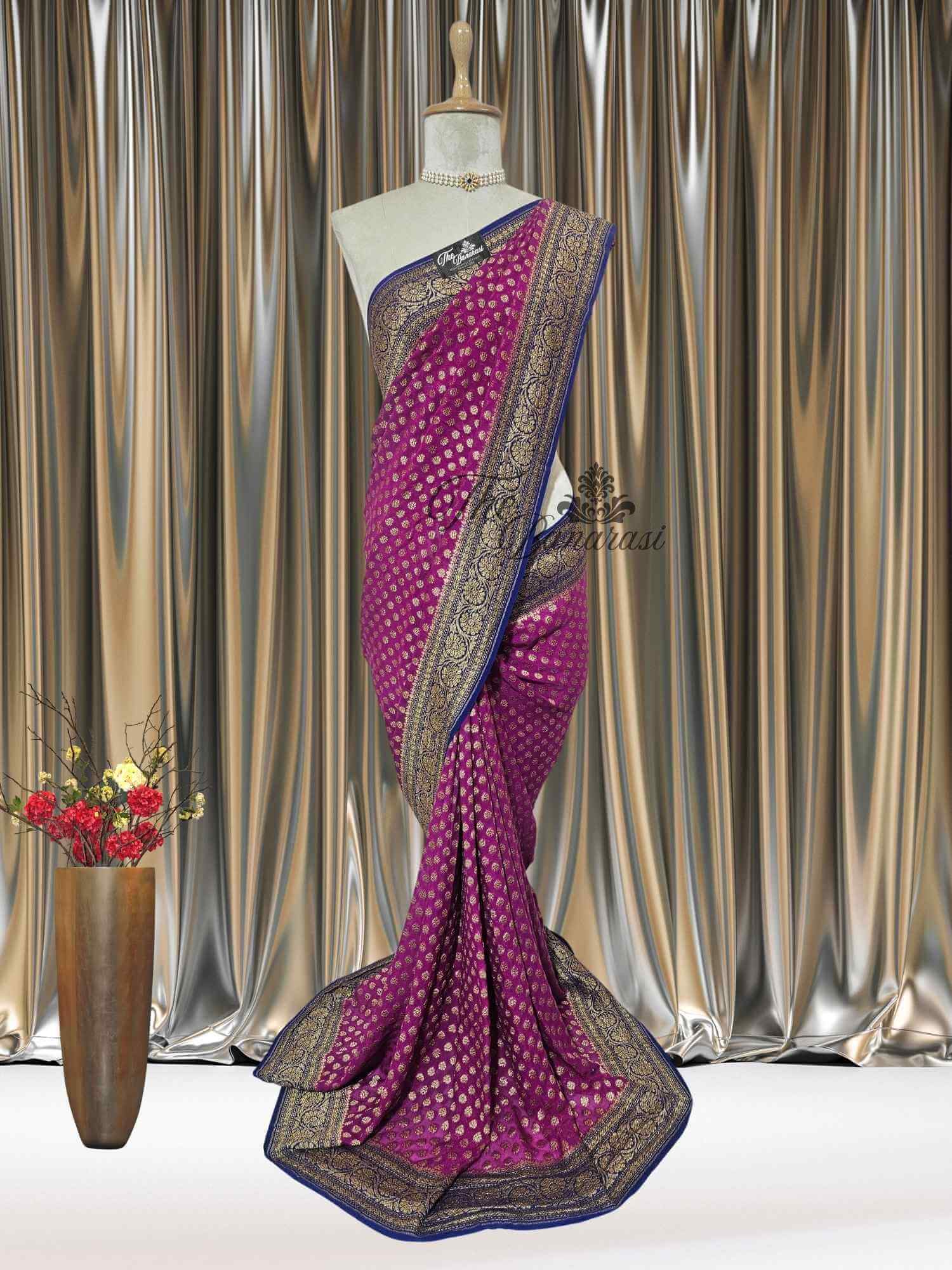 This Strawberry Pink Pure Khaddi Georgette Banarasi Handloom Saree blends elegance and tradition, crafted with beautiful antique zari work. Our Georgette is famous for its lightweight fabric and comfort. The khaddi georgette sarees are crafted by skilled Banarasi workers. This saree is perfect for festivals, weddings, and formal occasions. This saree adds a royal touch to your wardrobe with its rich color, qualified fabric, and traditional charm.