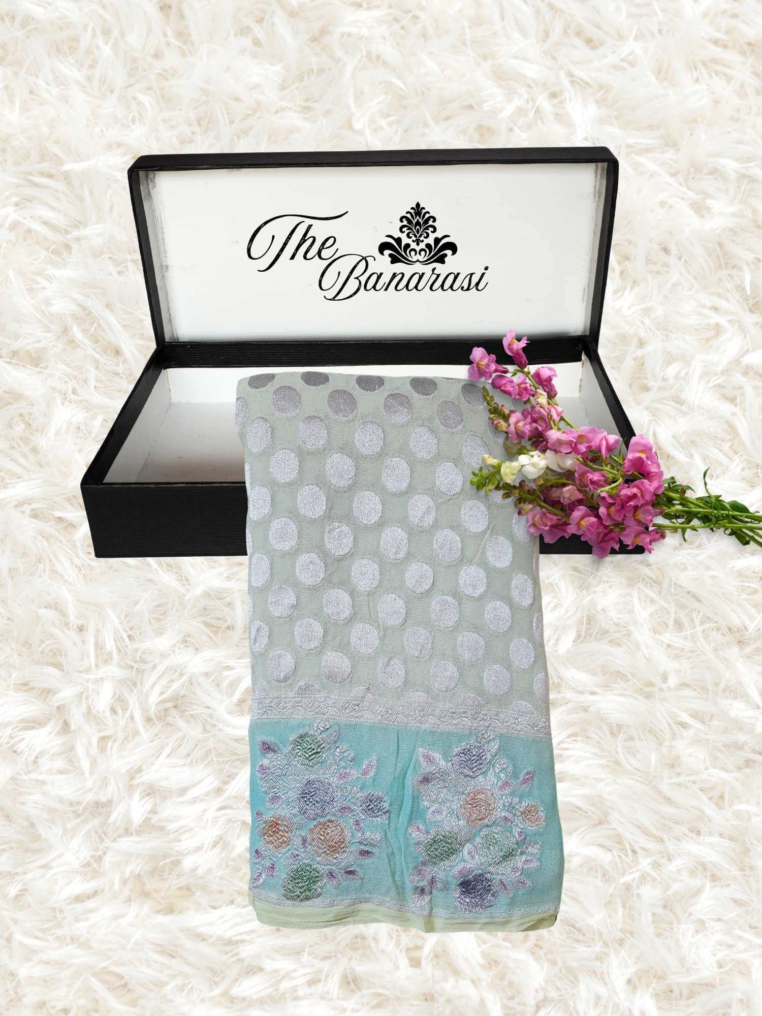 White Khaddi Georgette Hand Brush Water Zari Banarasi Handloom Saree